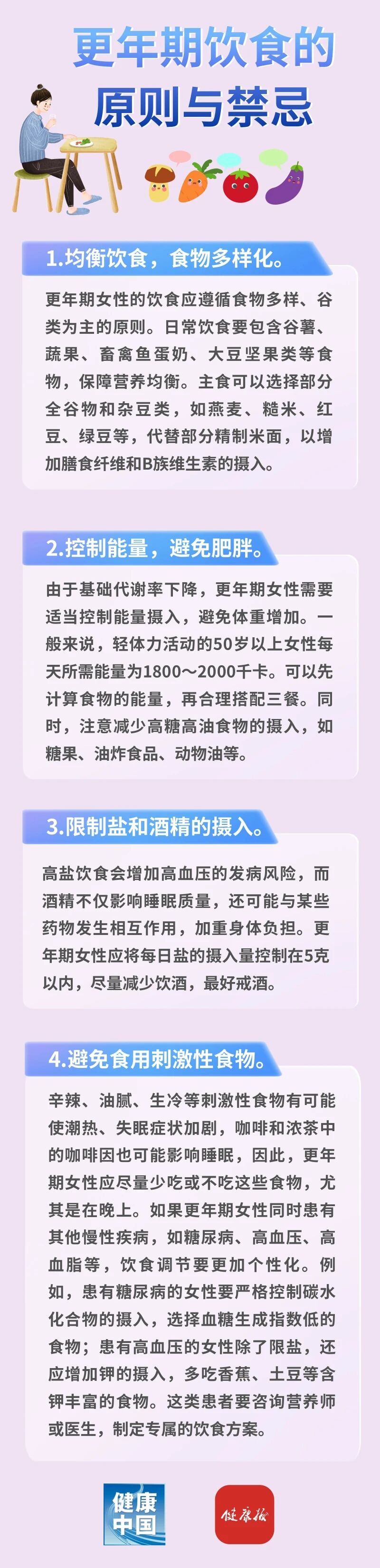 女性步入更年期,卵巢的内分泌功能会逐渐衰退,雌激素水平随之波动式下降,进而引发一系列身体变化。数据显示,女性在更年期每年骨量流失1%~2%,若不加干预,之后患骨质疏松症的风险将大大增加。同时,雌激素水平降低还可能影响血脂代谢,使得心血管疾病的发病率上升。此外,更年期女性的基础代谢率平均降低5%~10%,这意味着身体消耗能量的能力减弱。如果仍然保持以往的饮食习惯,很容易导致体重增加、脂肪堆积。因此,在饮食调节上,不仅要补充特定的营养素,还要合理控制能量摄入。