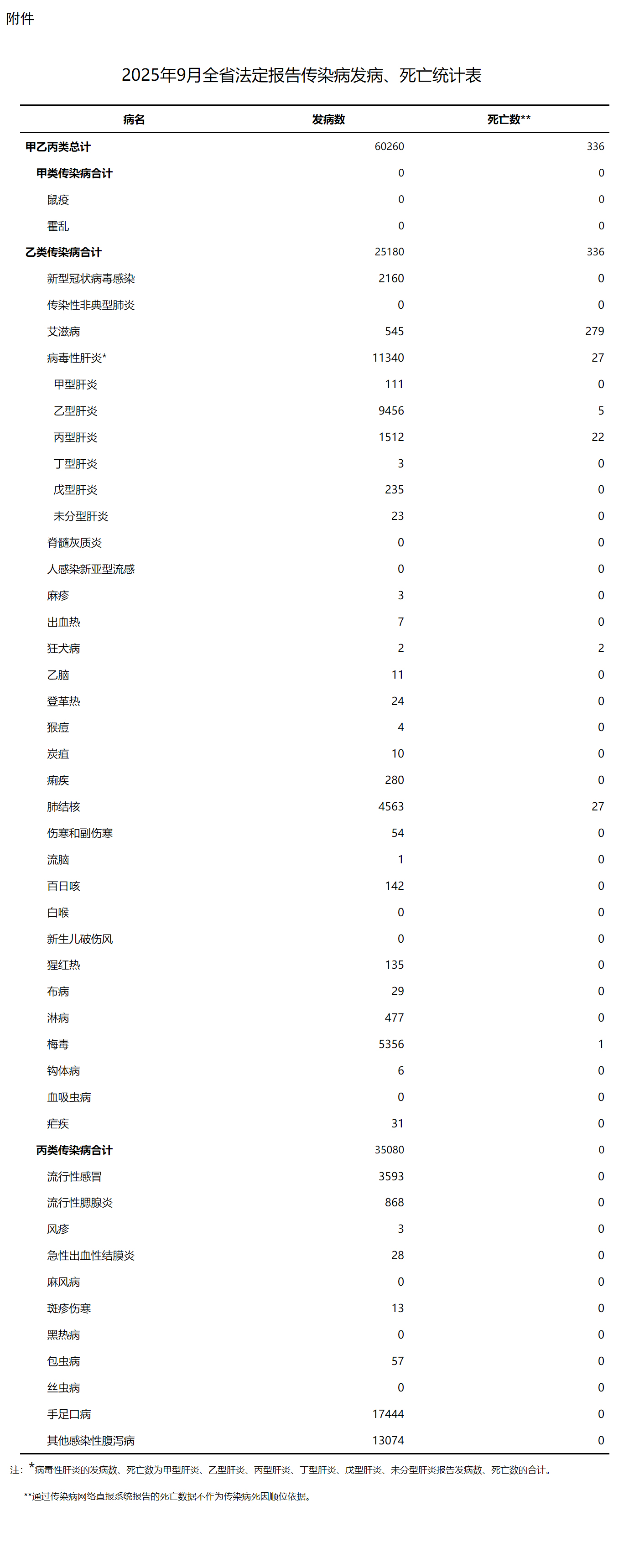 乙类传染病共报告21种,发病25180例,死亡336人;发病数居前5位的病种依次为:乙肝、梅毒、肺结核、新型冠状病毒感染、丙肝;死亡数居前3位的病种依次为:艾滋病、肺结核、丙肝。