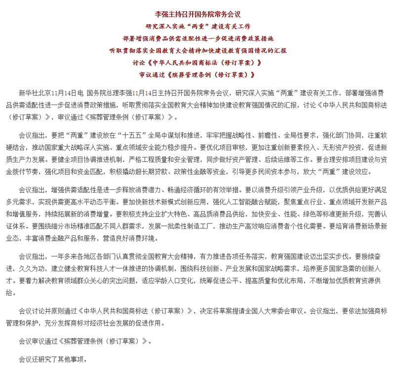 李强主持召开国务院常务会议 研究深入实施“两重”建设有关工作等