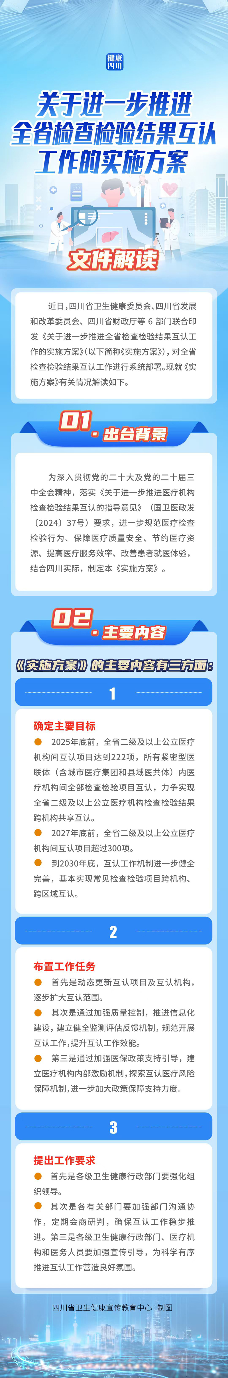为深入贯彻党的二十大及党的二十届三中全会精神,落实《关于进一步推进医疗机构检查检验结果互认的指导意见》(国卫医政发〔2024〕37号)要求,进一步规范医疗检查检验行为、保障医疗质量安全、节约医疗资源、提高医疗服务效率、改善患者就医体验,结合四川实际,制定本《实施方案》。